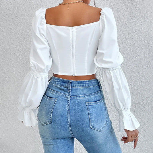 Slim Blouses Women White Puff Long Sleeves Crop Top