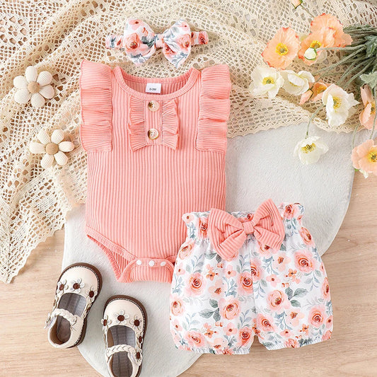 Baby Clothing Girl Summer Frill Trim Ribbed Romper + Elastic Waist Shorts + Bow Headband