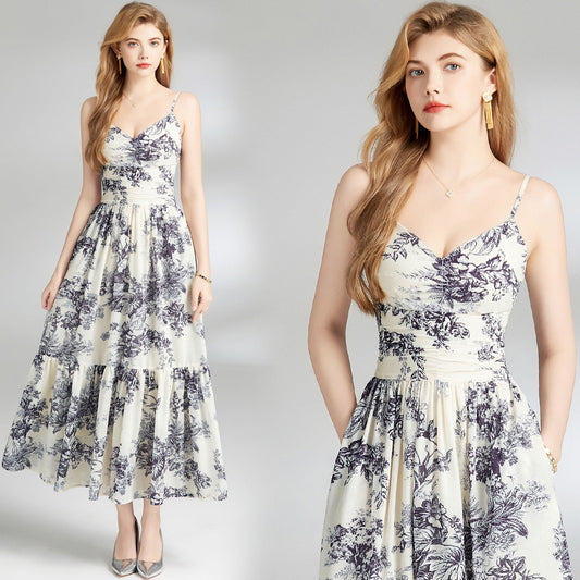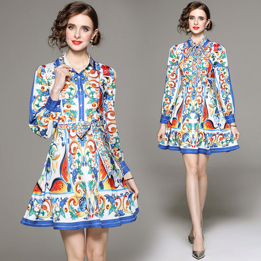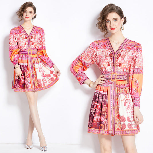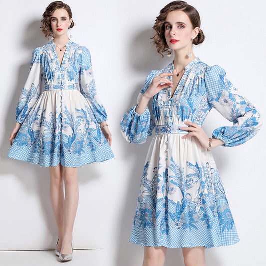 French Socialite Elegance Retro Printed Lantern Sleeve V-neck Waist-tight Dress