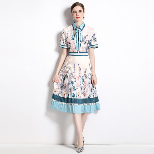 Fashion Elegant Short Sleeve Waist Pleated Printing Dress With Belt