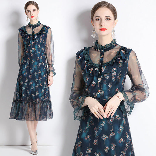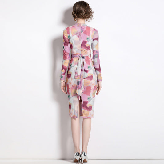 Mesh Floral Print Gentle Lace Up Slim Fit Tea Break Dress