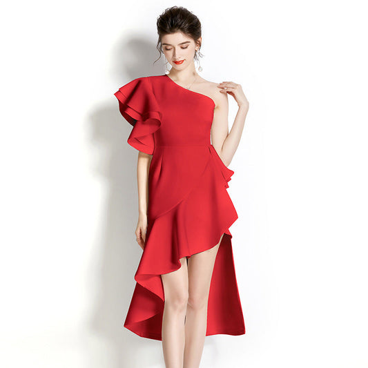 Three-dimensional Ruffled Shoulder Irregular Mid-length Dress