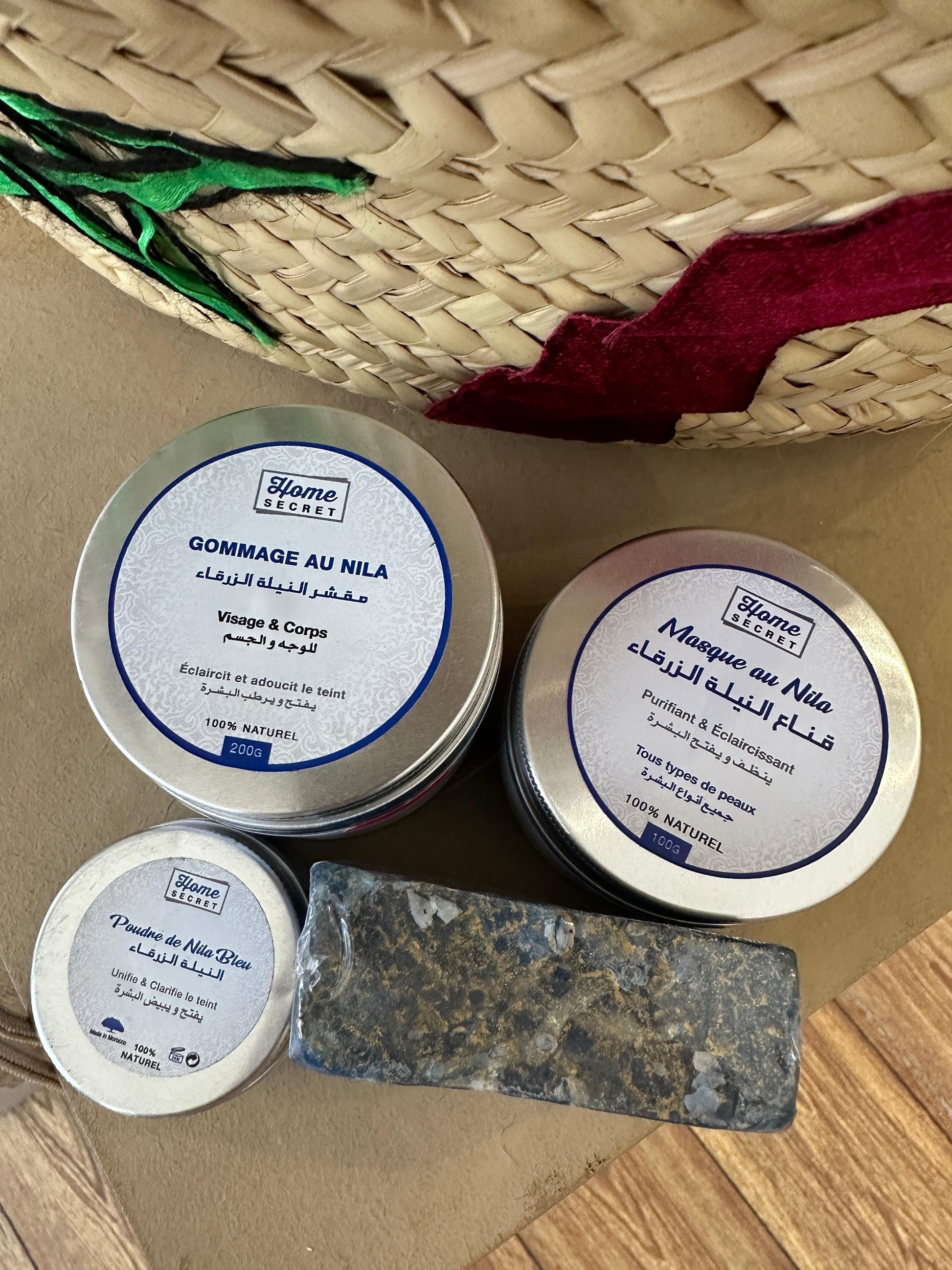 Pack de soin complet à la Nila bleue conçu pour une routine beauté efficace